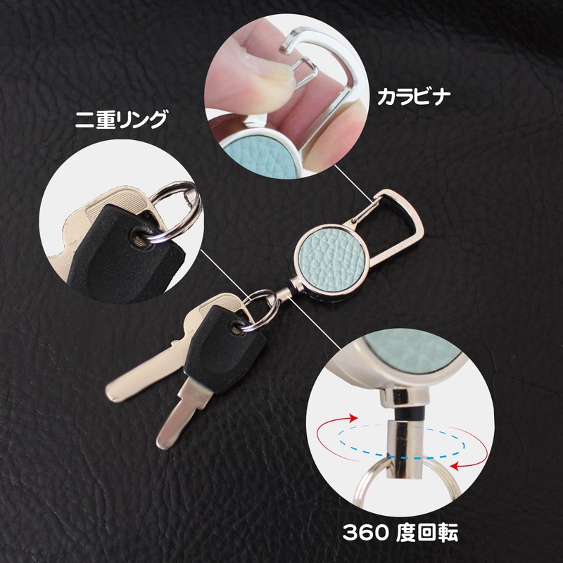 - カラビナとリールが一体型のキーホルダー。シュリンク加工した高級感のある牛革をワンポイントで使用した人気のカラビナ式リールキーです。カラビナ式なのでリュックをはじめカバンやズボンのベルトループなどに簡単に付けられます。