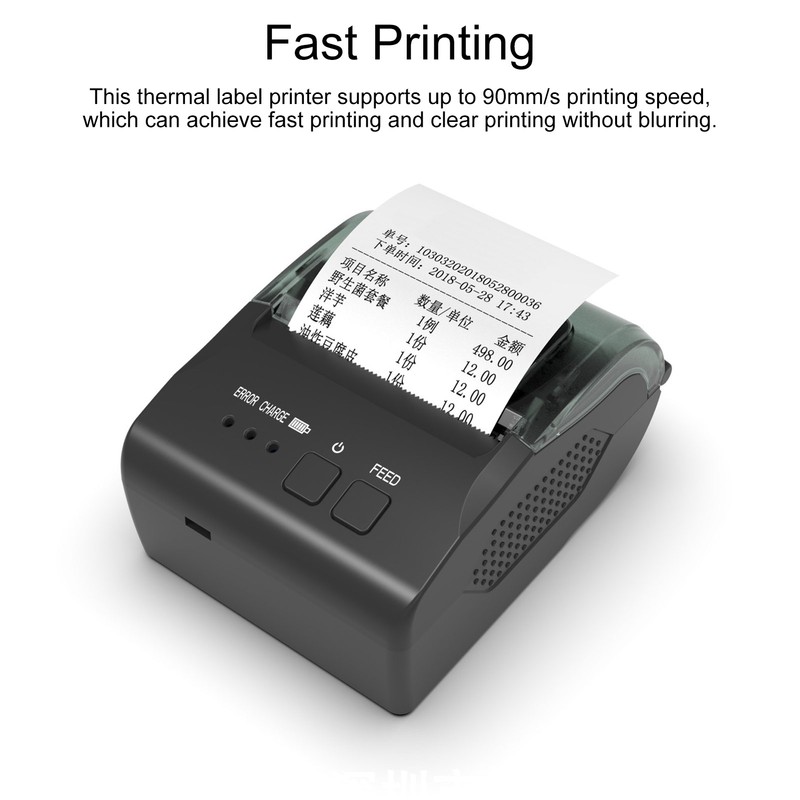 1、Fast Printing: This thermal label printer supports up to 90mm/s printing speed, which can achieve fast printing and clear printing without blurring. 2、Wide Application: This thermal label printer is suitable for super markets, retail, hotels, canteens, restaurants and coffee shop, etc. 3、Rechargeable Battery: This desktop label printer adopts 2000mAh rechargeable battery which can be easily charged via USB cable. 4、Toothed Blade: This 58mm thermal printer is designed with toothed blade which can help you tear off the label easily, improving working efficiency. 5、Supported System: This mini thermal printer is suitable for Win 9/2000/2003/7/XP/8/10/11, for Vista, for Linux, for OS X Laptop, for Android.