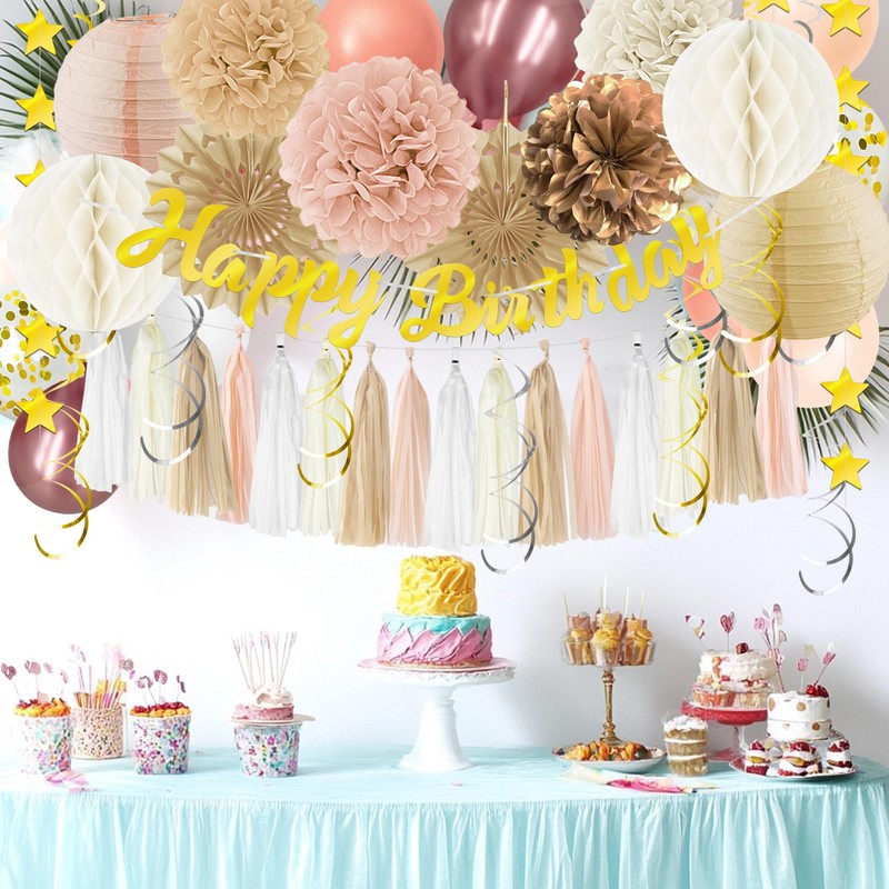 - Boho Birthday Party Decorations Includes:20pcs 12" latex balloons (5PCS skin color, sand white, retro pink, 3PCS rose gold, and 2PCS gold confetti balloons),1pcs gold "Happy birthday" Banner,4pcs tissue flower pom poms: 3pcs 8" and 1pcs 10" ,2pcs 8inch paper honeycom ball,2pcs 8inch paper lantern,1pcs star hanging stream,2pcs 10inch paper flower fan,6pcs Paper swirls hanging streamers,20pcs tassel garland