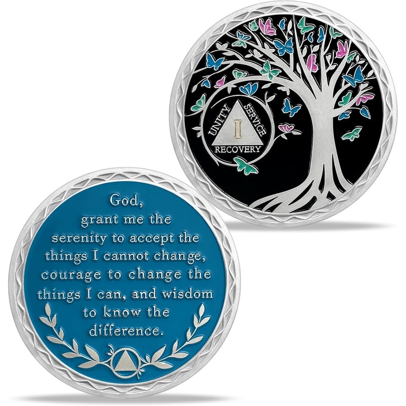 - Back side of aa coin and medallions features inspirational script "Serenity Prayer" in gentle blue background and bottom is AA Symbol surrounded by branches of tree of life.