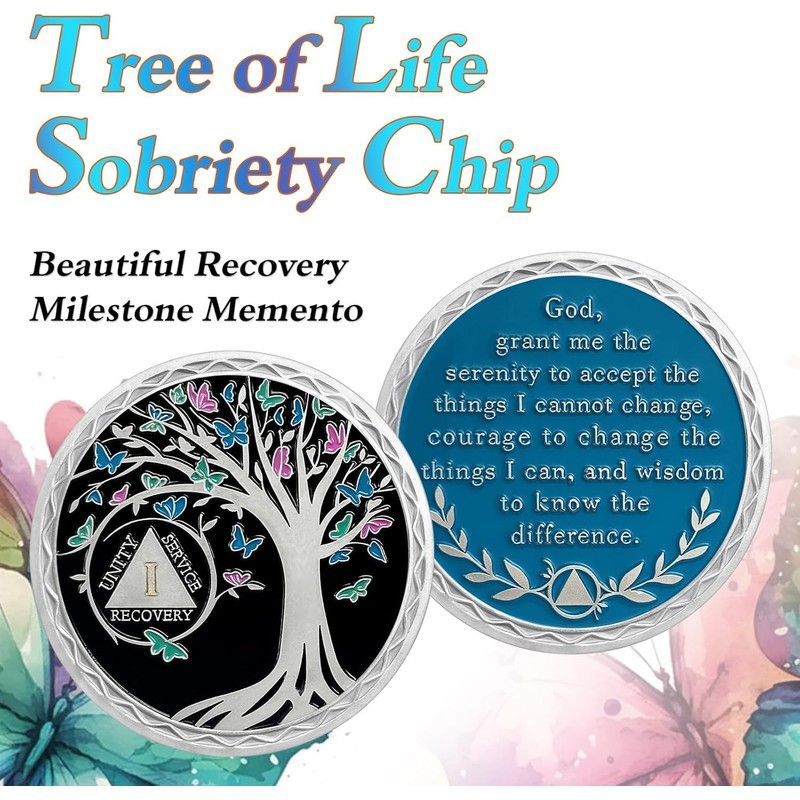 - Front side of years sobriety chip engraves a strong Tree of Life with enamel butterfly in green, blue, pink, also have Three Legacies motto: "Unity, Service, Recovery". Special laser anniversary number signifying the length of sobriety.