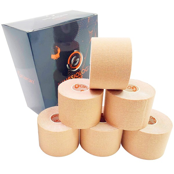 キネシオロジーテープ 、 防水性と防汗性の超弾性テーピング 、コットン通気性ラテックスなしテーピングテープ、肩、腕、腰、ふくらはぎ、太ももの筋肉や関節用のキネシオテープ、5cm * 5mスキントーン6ロール