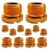 About Item : PRECISE THREADING MIC STAND ADAPTER - 5/8 Male to 3/8 Female thread, fits most microphone stand & adapters. ALUMINUM MADE - Withstands rigorous use and securely support the weight of your mics or accessories. ANTI SLIP DESIGN - Unique surface on stand adapter for excellent grip, easy installations & removal. ANTI VIBRATION DESIGN - Minimizes handling noise which is essential for achieving high-quality audio MULTI PURPOSE - The conversion connector fit the camera, recorder, mic stand, and other accessories. Mic stand adapter Description Upgrade your audio setup with our precise threading mic stand adapter. This robust 5/8 Male to 3/8 Female thread adapter fits most microphone stands and accessories, ensuring a secure fit. Made from durable aluminum, it withstands rigorous use while offering excellent anti slip and anti vibration design to minimize handling time. Perfect for cameras, shock mounts, mic stands, and more, it features corrosion resistance and a smooth finish for a professional look. Compact and lightweight, these mic stand adapters are easy to carry, making this mic stand adapter ideal for frequent setups and teardowns. Enhance your audio quality with this reliable and versatile adapter. Mic Adapter for Microphone Stand Features CORROSION RESISTANCE SMOOTH FINISH COMPACT AND LIGHTWEIGHT WHAT YOU GET Designed to endure various environmental conditions, our adapter resists rust and corrosion, ensuring long-term reliability. The adapter boasts a unique surface with a clean, smooth finish, free from sharp edges or imperfections, ensuring a professional look and feel. The mic stand adapter is small and compact, the portable design makes it convenient to carry and ideal for frequent setups and tear-downs. The package includes 2 pieces of a microphone stand mount adapter, enough quantity for upgrade or replacement. Mic Stand Specification : Color : Gold Material : Aluminum Thread : 5/8 Male to 3/8 Female Package Includes : 12x Mic Stand Adapters About Brand 5 Core, ISO Certified headquartered in California, warehouse in Ohio, USA. Offering 600+ products since 1984. Tested and Certified Products, ensuring highest quality and reliability.About Item :
