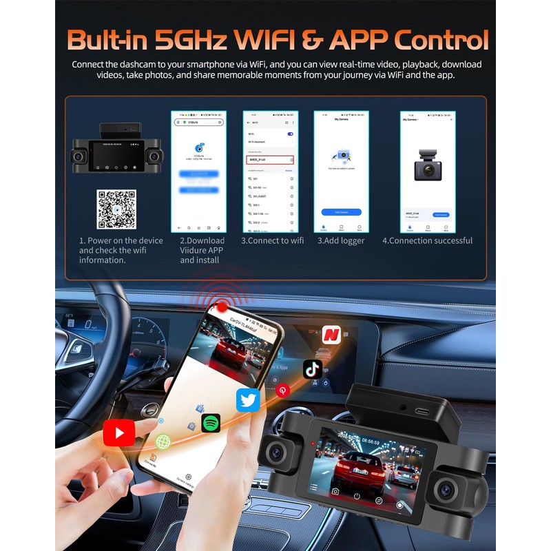 - Built - in WiFi & APP Control: 360 Dash cam equipped with WiFi, it connects seamlessly to your smartphone via a dedicated app. You can easily view, download, and share footage without removing the memory card. The app also allows for remote settings adjustment, making operation convenient and efficient.