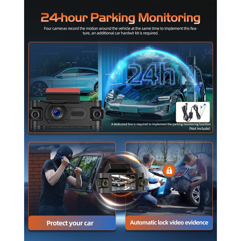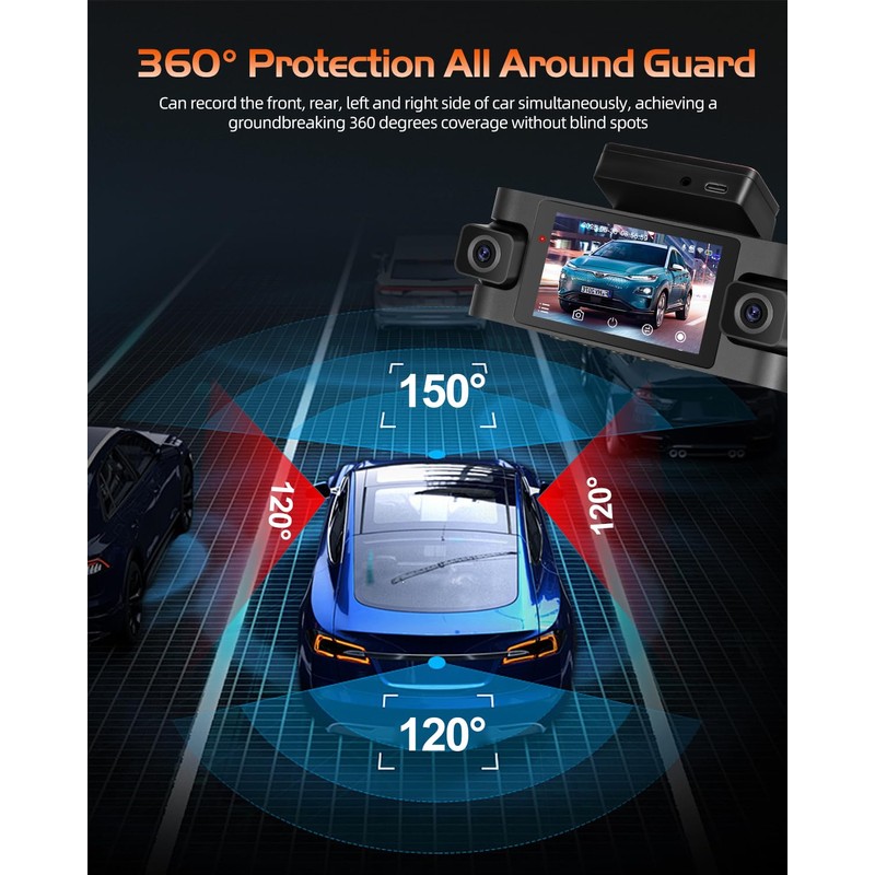 - 2K 4 Channel Dash Cam for Cars: 3 Inch dash cam features 4 channels, with the front camera recording in 2K resolution and the other three (Left、Right and Rear) in 1080P. It captures every detail around your vehicle, from front-end incidents to side and rear events, providing comprehensive coverage for complete peace of mind.