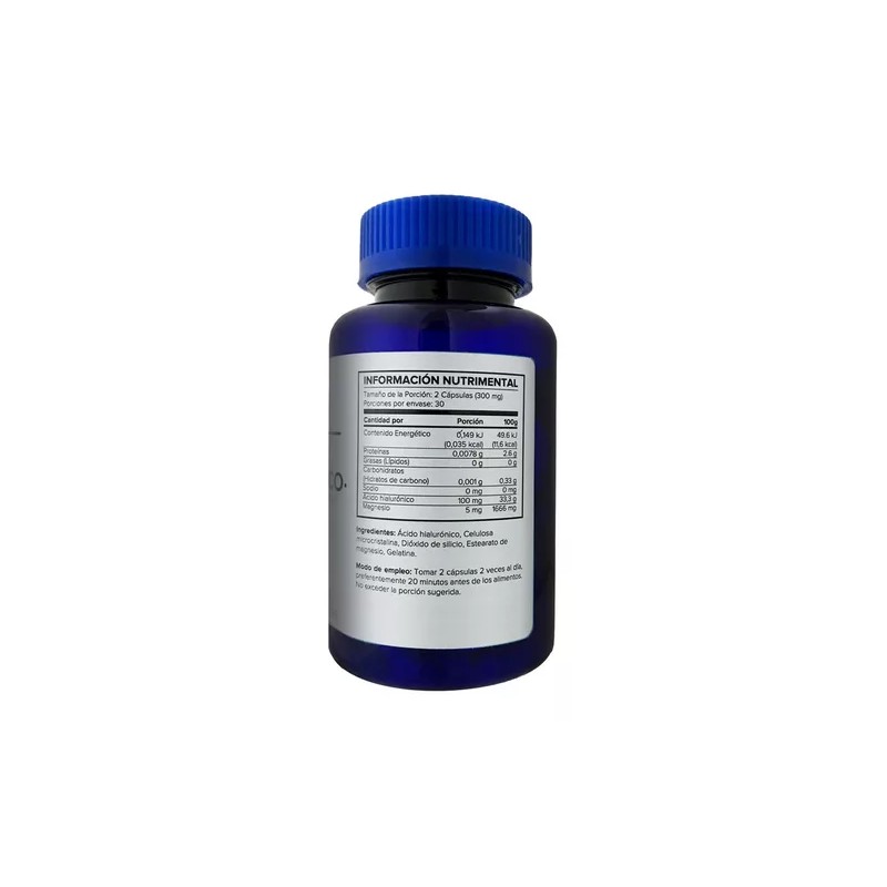 Suplemento alimenticio a base de ácido hialurónico, cada porción contiene 100 mg de ácido hialurónico. Ayuda a evitar que la piel pierda elasticidad. El ácido hialurónico es un gran aliado para el cuidado de nuestra piel.
