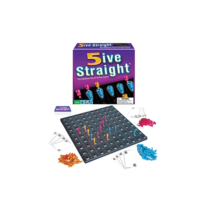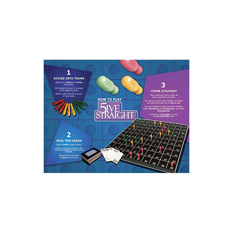 one piece plastic game board, three colors of colored pegs and a deck of 100