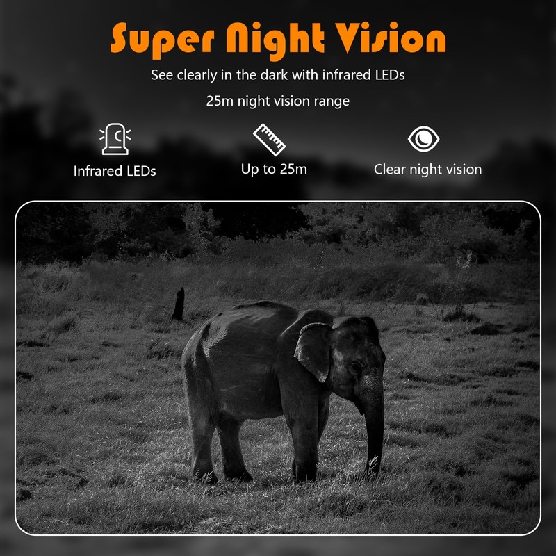 - [Trail Camera with Night Vision]:: The trail cam features low-light night vision and 120° wide-angle view. With a night vision range of up to 65 feet, you can vividly capture in all directions, even in the dark.