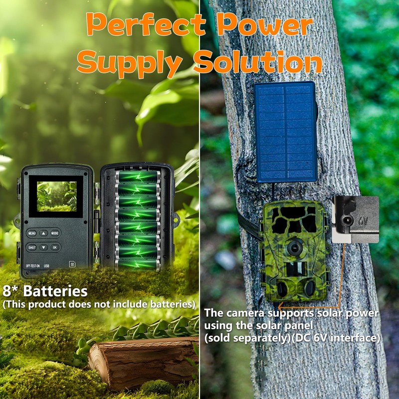 - [Versatile Wildlife Camera: Easy to Install]: The all-in-one solar panel trail camera design requires no wiring and can be deployed in minutes!This wildlife camera includes a carrying strap, Type-C cable,a 64GB SD card and trail camera solar powered for documenting plant growth or farm safety.The trail cameras with night vision motion activated waterproof design and auto-rewrite feature make it the ultimate tool for hunters.