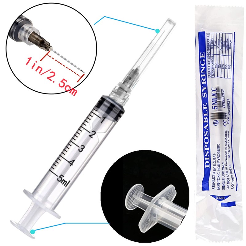 • Package: 20pcs 5ml/cc Plastic luer lock syringe with 22Ga and cap, enough for use or replacement.