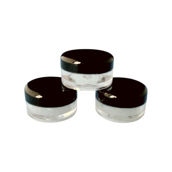 - PACK OF 10. Empty 5ml clear plastic jar with a black screw on lid.