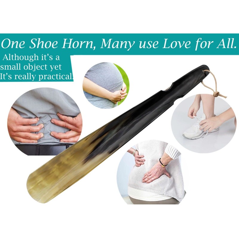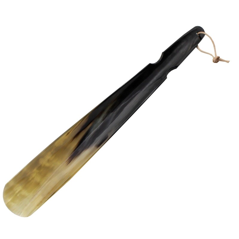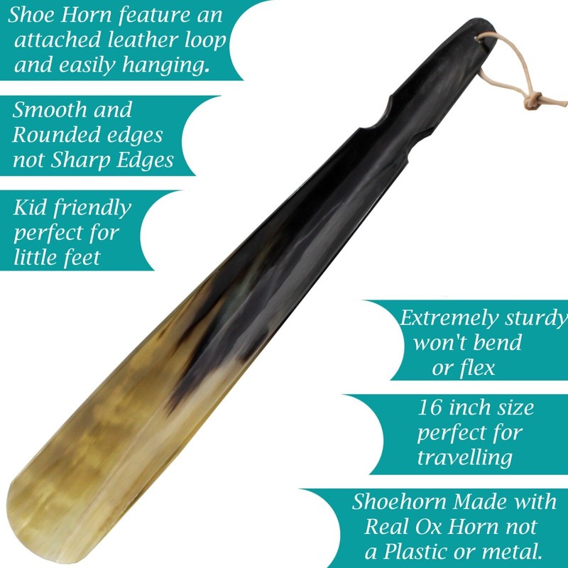 - REAL HORN NATURAL SHOE HORN NOT A CHEAP PLASTIC OR METAL SHOEHORN. - Each shoehorn is unique in colour due to the natural horn material makes for a beautiful and solid shoe horn. Approx 16" x Long and 3" wide so it is strong and won't bend. and protect your shoe investment.