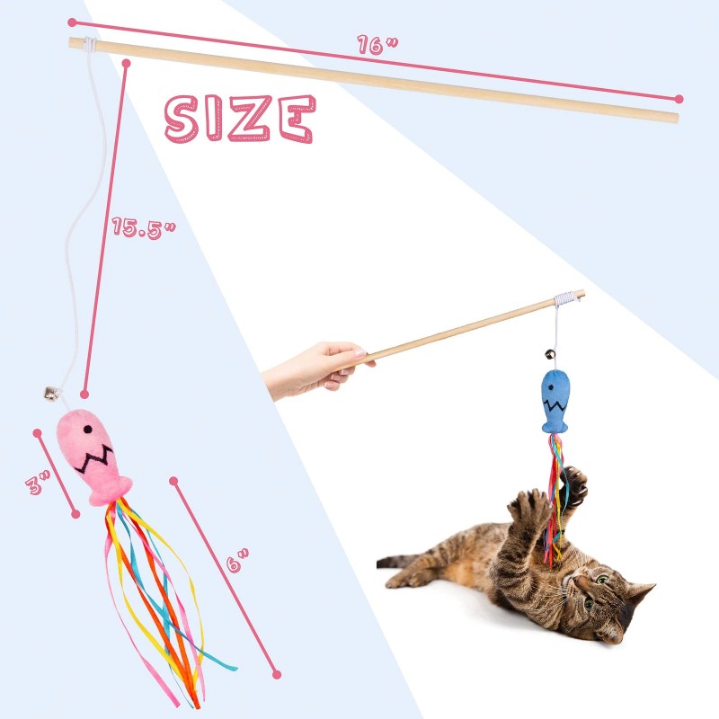 5 REPLACEABLE KITTY TOYS: This high quality cat teaser features durable and safe, no worries cats to play it. The plush fish is filled with pp cotton and catnip, which is non-toxic, suitable for chewing and dragging. The 5 pack cat charmers last long keep your cat entertained.