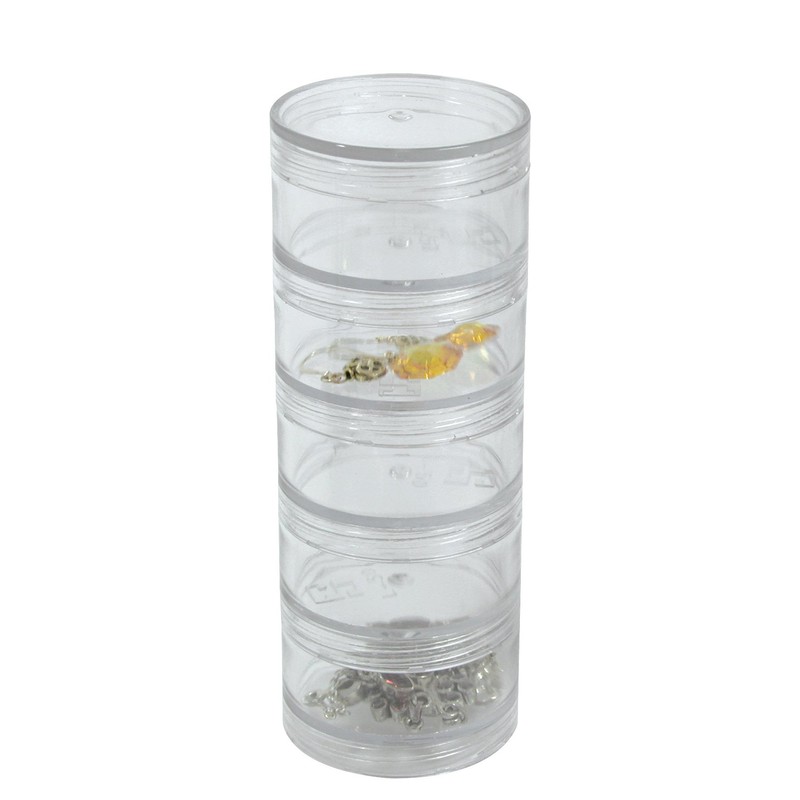 • Convenient Stackable 5" x 2" Trays for storing small parts, beads, stones or other small objects. Each clear plastic tray has a threaded bottom that securely screws to the tray below it, allowing access to any tray at any level.