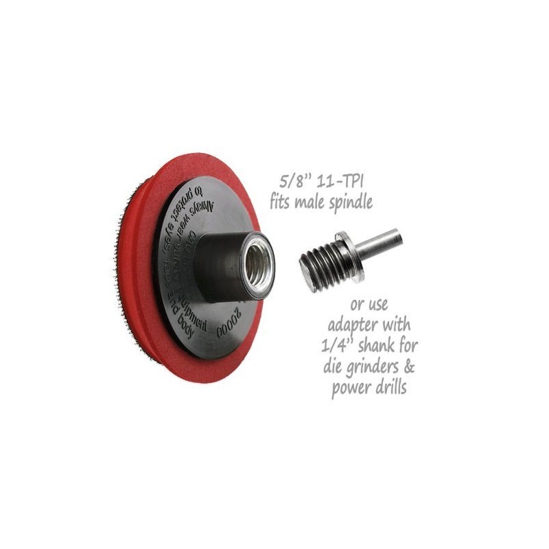 - Hook & loop backing pad, female 5/8" 11-TPI thread plus 1/4"-shank adapter fits drill chuck, die grinder