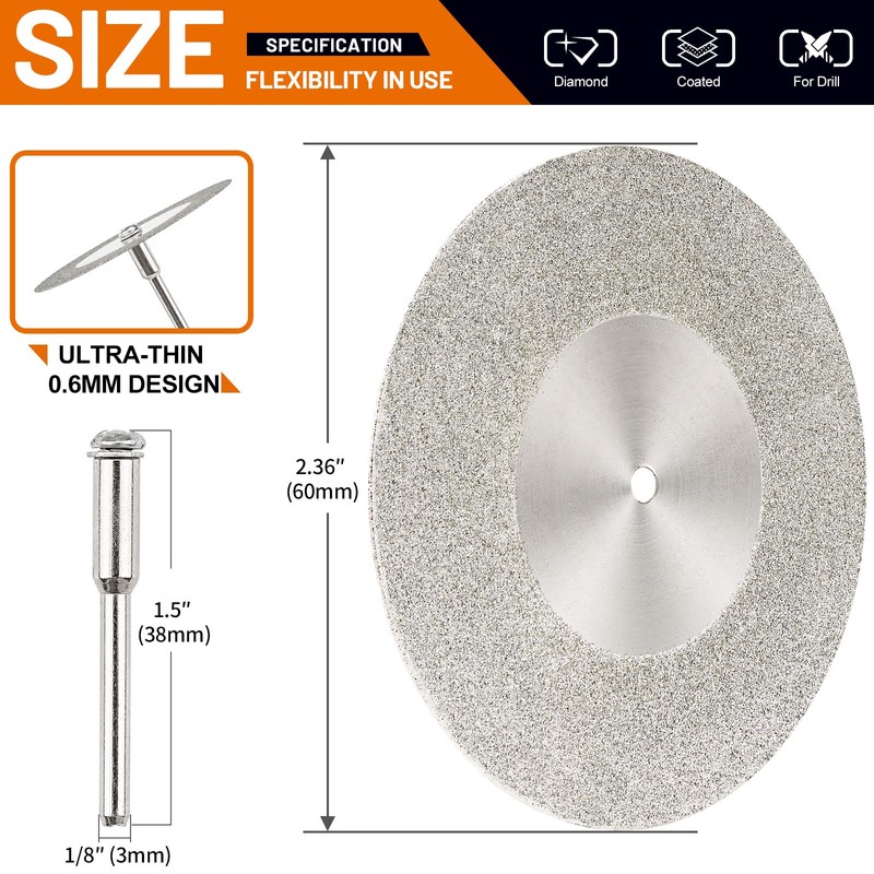 - Designed for Dremel ,Cutting discs diameter: 60mm; Mandrel Diameter:3.0mm. Turn your Dremel or other rotary tool into high-speed cut-off saw & grinding machine.