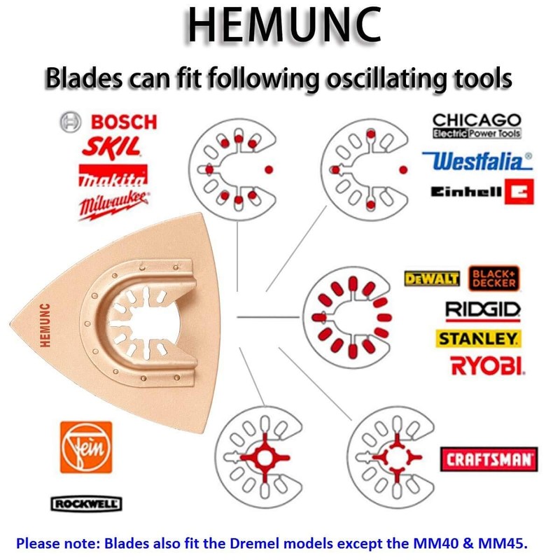 - [Compatible With Most Oscillating Tools] This mixed carbide multi-tool blades set is compatible with the majority of the oscillating tool brands such as Fein Multimaster, Ryobi, Hitachi, Chicago, Mastercraft, Milwaukee, Ridgid, Black & Decker, Rockwell, Dewalt, Einhell, Porter Cable, Craftsman and more.