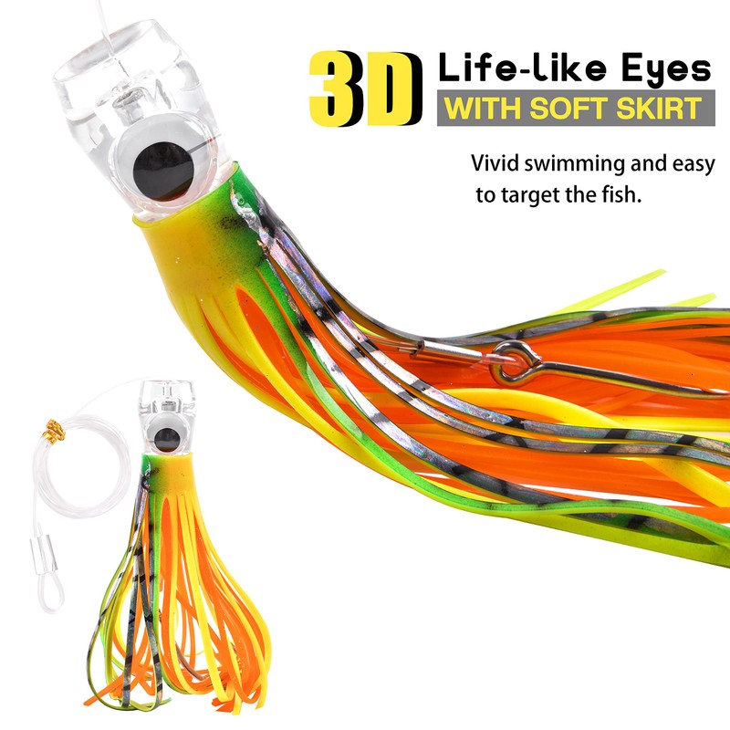 - Acrylic head with vivid 3D eyes, beautiful bright colors skirts, the saltwater lures splash waterflower when trolling in a high speed and moved vividly like real fishes. Lifelike appearance helps to attracts more fish from greater range
