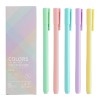 set of five colored gel pens, each with a 0.5mm fine point. The pens come in pastel shades of green, pink, blue, purple, and yellow. Gel pens use a water-based ink that flows smoothly, creating a comfortable writing experience. They are popular for their vibrant colors and smooth writing, making them suitable for various tasks, including note-taking, journaling, and art projects.