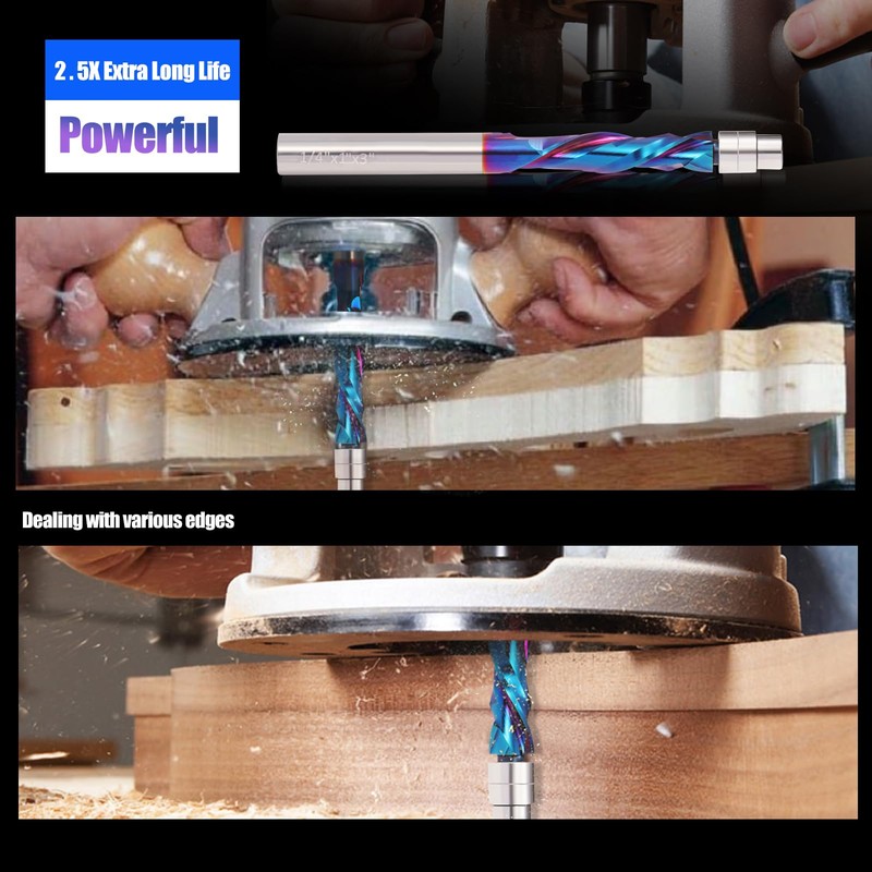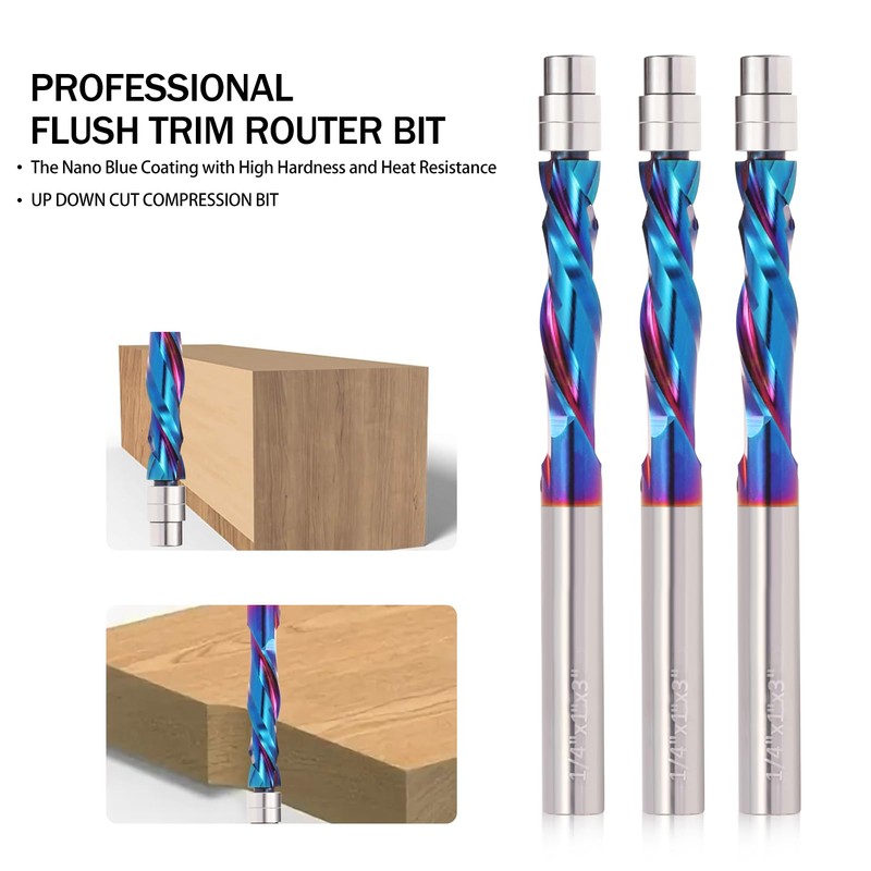 • Blue Nano Coating: Up to 2.5X longer life compared to uncoated bits. The flush-trim spiral router bits is sharper and stay sharp longer than conventional flush-trim router bits.