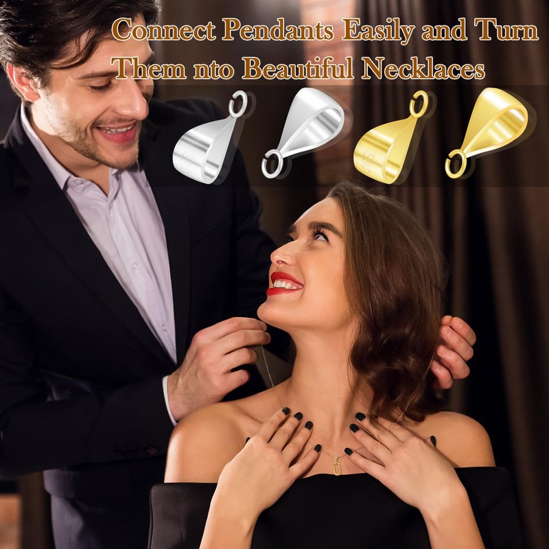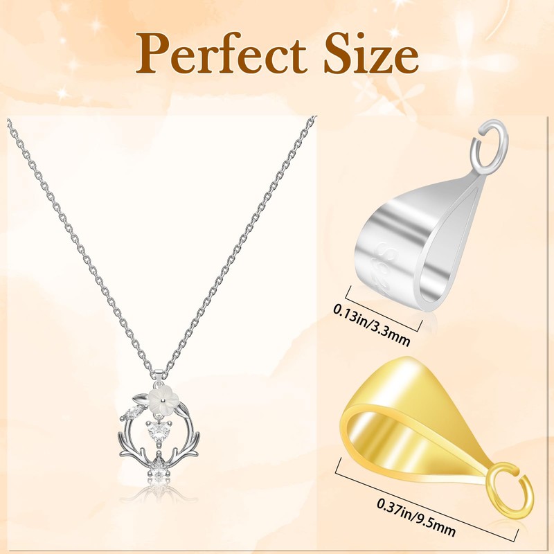 - 【Perfect Sizes】Pendant bail clasp size:4.5 x 11mm / 0.18 x 0.43in with 3.0mm / 0.12in opened loop. The top loop of jewelry bail is wide enough to slide through metal chain, waxed cords, strings, ropes, and easy to fix to the pendant. We have two colors available: silver and gold. Natural colors can complement your jewelry perfectly, adding charm to your jewelry.