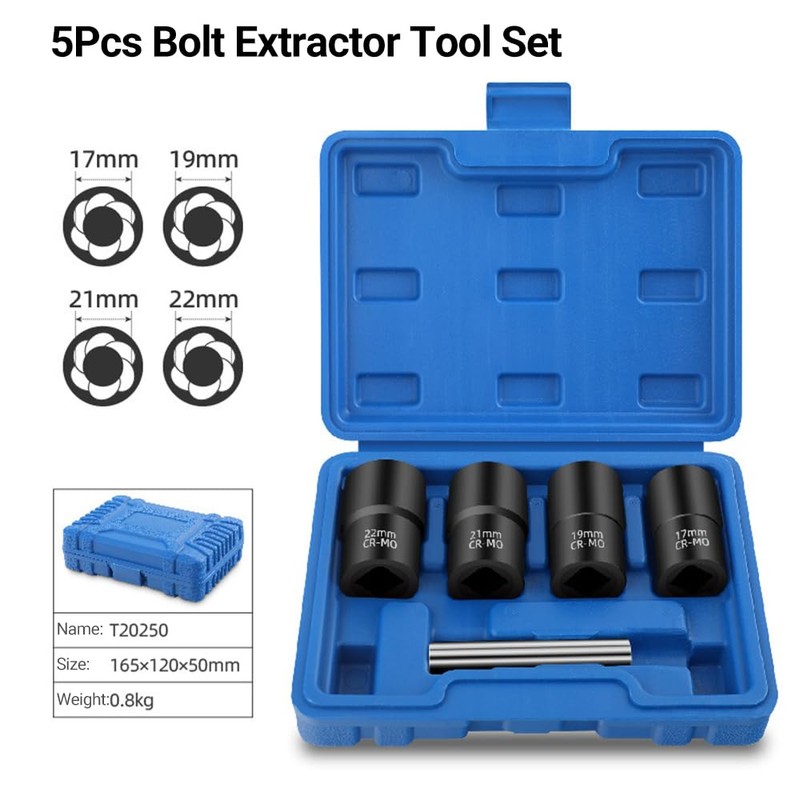 - 【Various Sizes in One Set】5 pieces 1/2 inch drive bolt & nut remover kit comes with easily readable marks: 17mm, 19mm, 21mm, 22mm, 12mm.