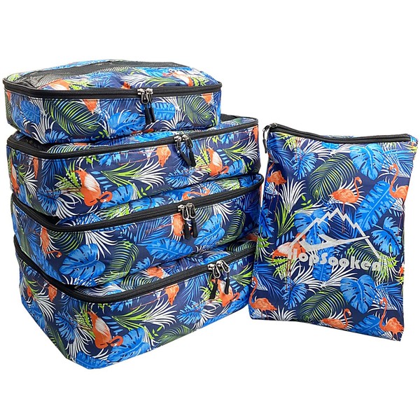 5PCS Travel Packing Cubes Value Set Clothes Luggage Organizers Compression Pouches (Light blue leaf)