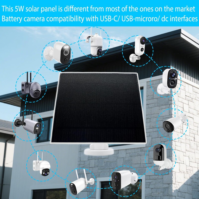 - Sustainable Power Supply Say goodbye to the hassle of frequently replacing batteries or plugging in to charge. The 5W high-efficiency solar panel converts sunlight into a stable power supply, providing continuous energy for your outdoor camera. It keeps your surveillance equipment reliably powered.