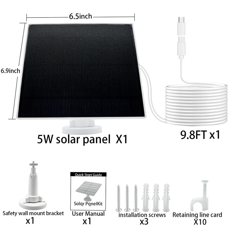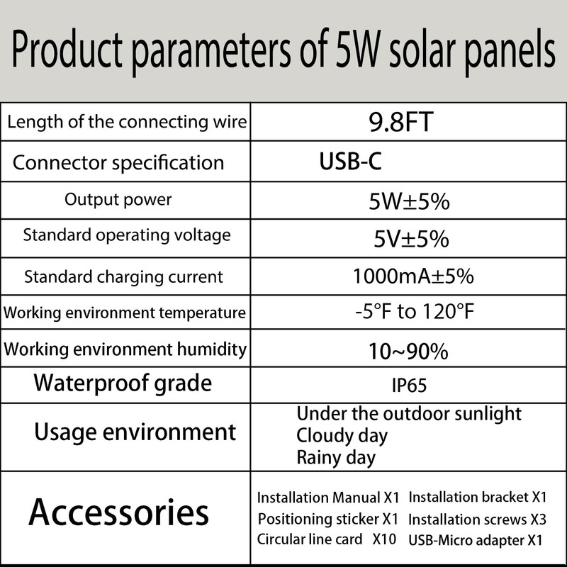 - Complete installation kit, this solar panel comes with all necessary accessories: 1 x adjustable mounting bracket, 3 x fixing screws, 1 x detailed installation manual, 1 x USB Micro adapter, and 10 x round cable clamps. Step-by-step manual guides you through quick assembly.
