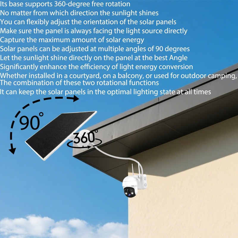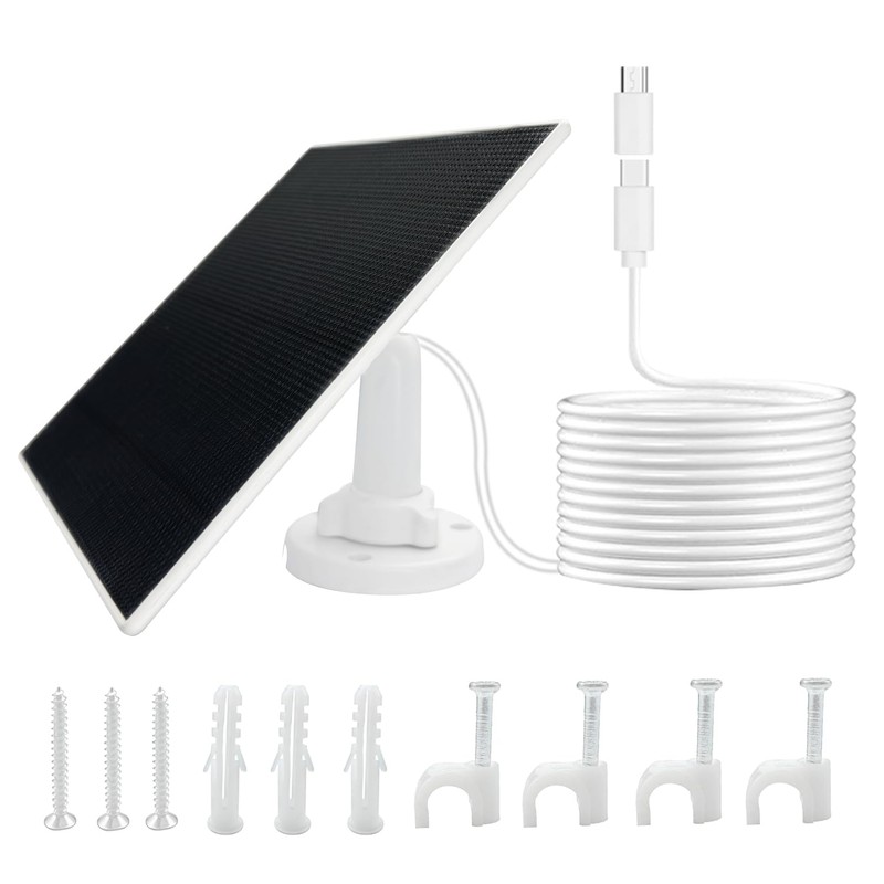 - Absorb sunlight to the maximum extent and adjust flexibly Equipped with a 360° rotatable mounting bracket and a 90° adjustable solar panel, this 5W solar charger enables you to effortlessly direct the panel to sunlight from any Angle. Whether installed on a wall, a tree or a utility pole, it ensures the best sunlight throughout the day, allowing your outdoor camera to charge continuously without frequent manual adjustments