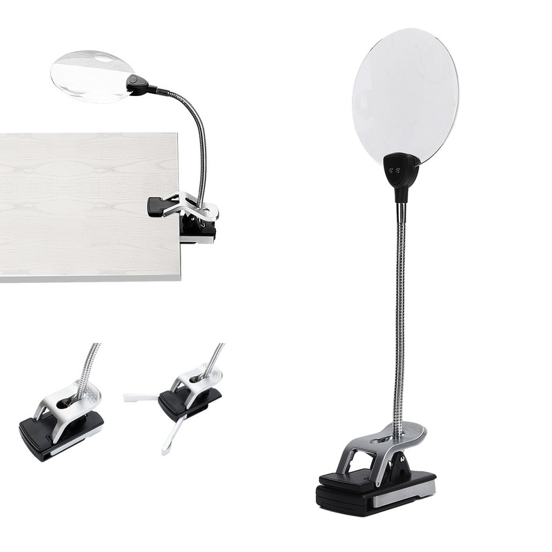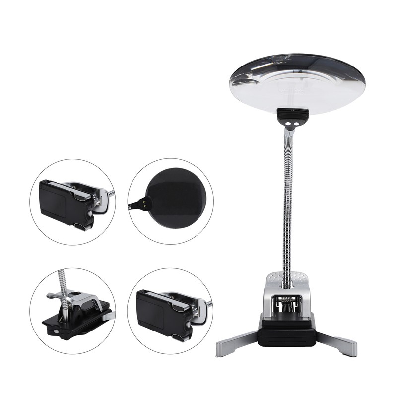1、Base double layer design, can clip and can stand, easy to use so that the viewing effect is more clear. 2、Gooseneck can be adjusted at will, so you can use where you want, release your hands and easy to use. 3、The base or sturdy clip ensures that the lamp does not tilt, so you can enjoy comfortable close working. 4、Widely used for jewelry making, reading, repairing electronic products, etc. An indispensable table magnifying glass at home. 5、Excellent ABS and metal material, durable and reliable in use, not easy to damage and break.