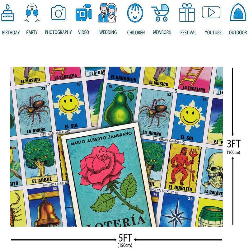 5x3ft Loteria Cards Themed Backdrop Mexican Party Theme Mexico Loteria Cards Photography Background Mexican Fiesta Birthday Decorations Banner Newborn Adult Portrait Photoshoot Photo Booth Props