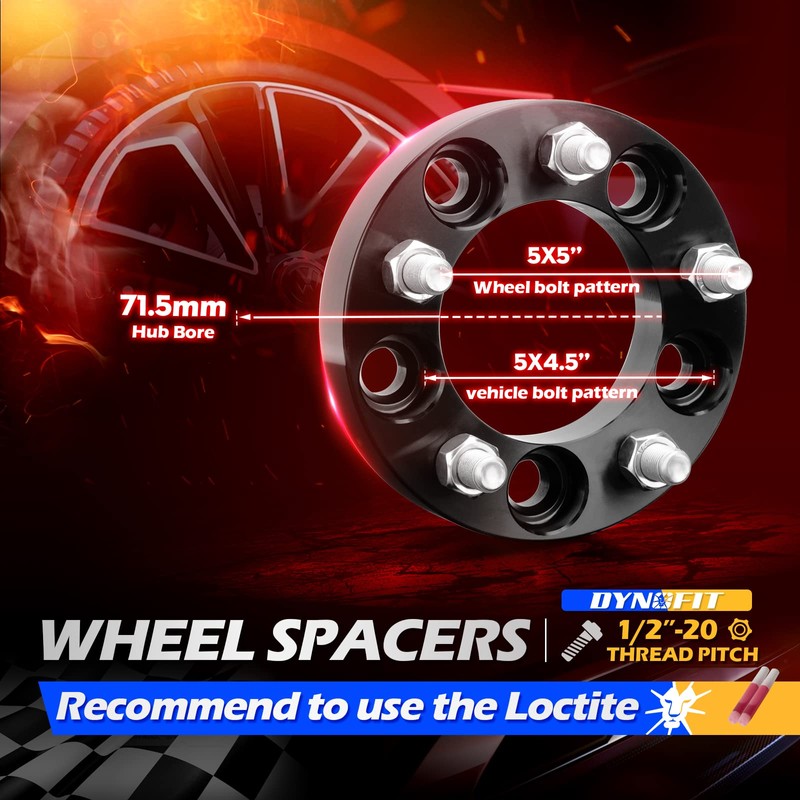 - 【Wheel Spacer & Adapter Parameter】Wheel bolt pattern = Vehicle bolt pattern = 5x4.5"(114.3mm) to 5x5"(127mm), Hub Bore: 71.5mm, Thickness: 1.25"(32mm), Nuts/Studs Thread Pitch: 1/2-20, Set of 4 pcs wheel adapters.***NOTE: Vehicle Bolt Pattern Must Be 5x4.5"(5x114.3mm), Wheel Bolt Pattern Must Be 5x5"(5x127mm). ONLY WORKS with 5x5"(5x127mm) WHEELS! NOT Fit 5x4.5"(5x114.3mm) WHEELS!