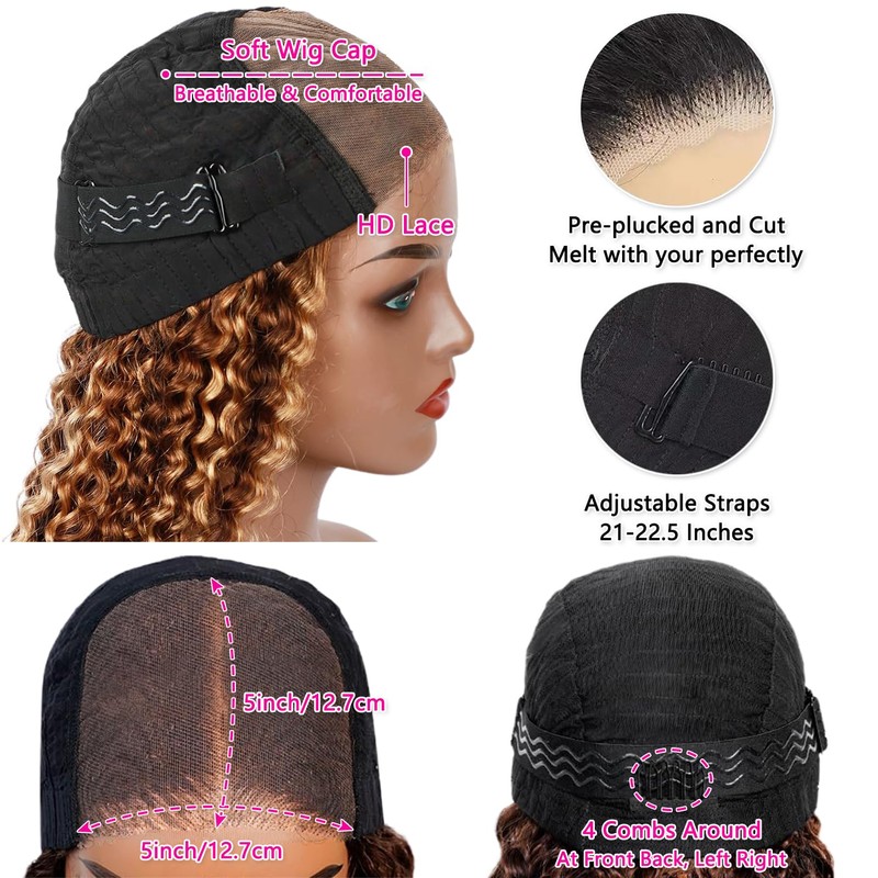 • 5x5 HD Lace Closure Wigs Lace Size: Deep wave glueless wigs with human hair pre-plucked and cut, Can be Part Freely, medium cap size (21-22.5 Inches),3 clips to fix the cap, with an elastic black band inside the cap, Adjustment