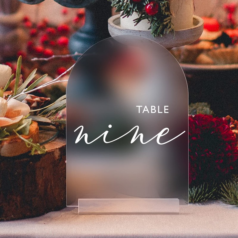 - Frosted Arch Acrylic Sign with Stand: Frosted glass look acrylic is so on trend for this year's wedding party decorations. These gorgeous acrylic wedding table signs will look stunning on your tables and go with any wedding style, from morden through to timeless and classic.