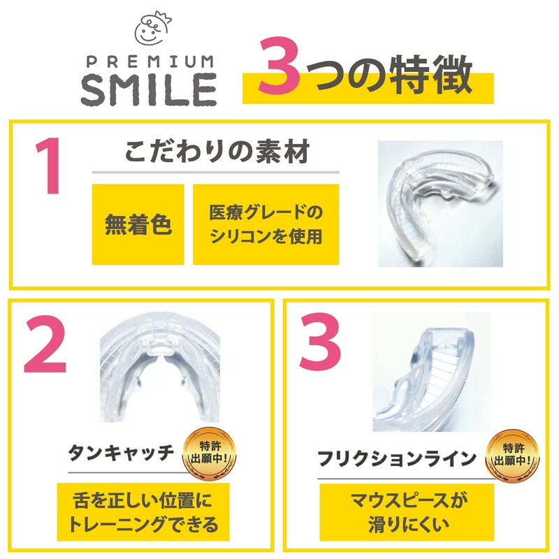 - 【子ども専用トレーニングマウスピース】 「「PREMIUM SMILE」は日本人のお子様に合わせて設計したトレーニングマウスピースです。お口ぽかん、おしゃぶり癖、口呼吸、生え変わりの際のトレーニング、口周りの筋肉トレーニング、就寝時の歯ぎしり、食いしばりのお悩みにご活用ください。