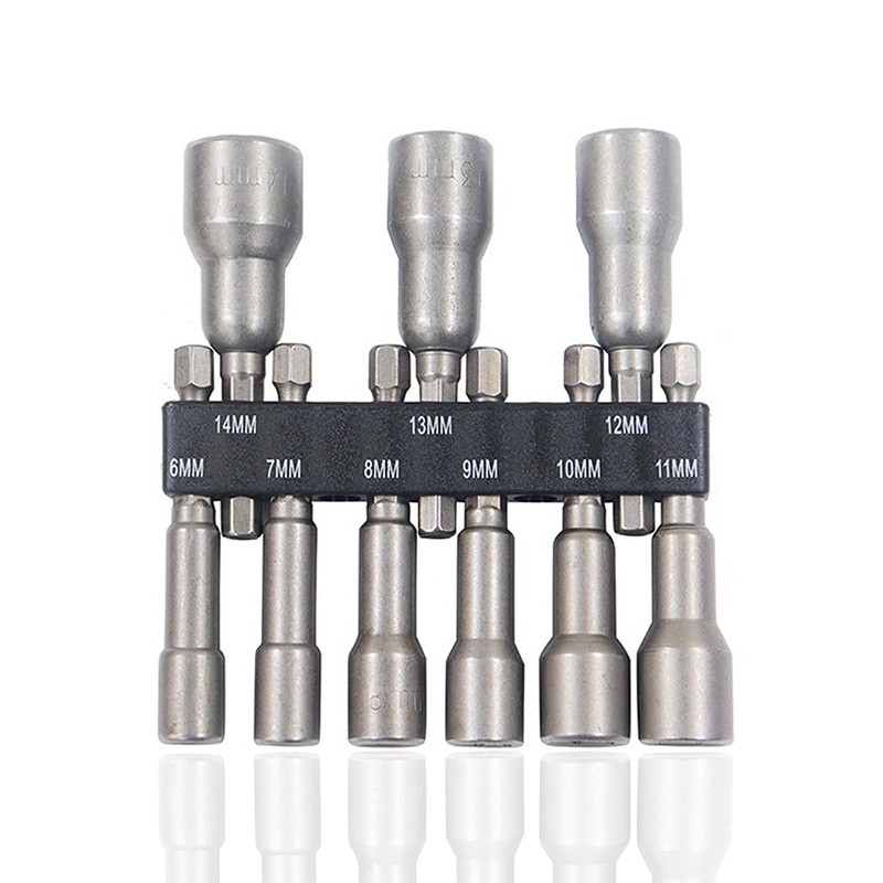- 【9 Sizes】 9 * Magnetic Nut Driver Se (one for each size). 9 different sizes: 6mm, 7mm, 8mm, 9mm, 10mm, 11mm, 12mm, 13mm, 14mm. Inner hexagon sleeve can be used for many jobs, e.g. Woodworking, car and machine repair. Enjoy a versatile toolset that is compatible with all 6.35mm chucks.