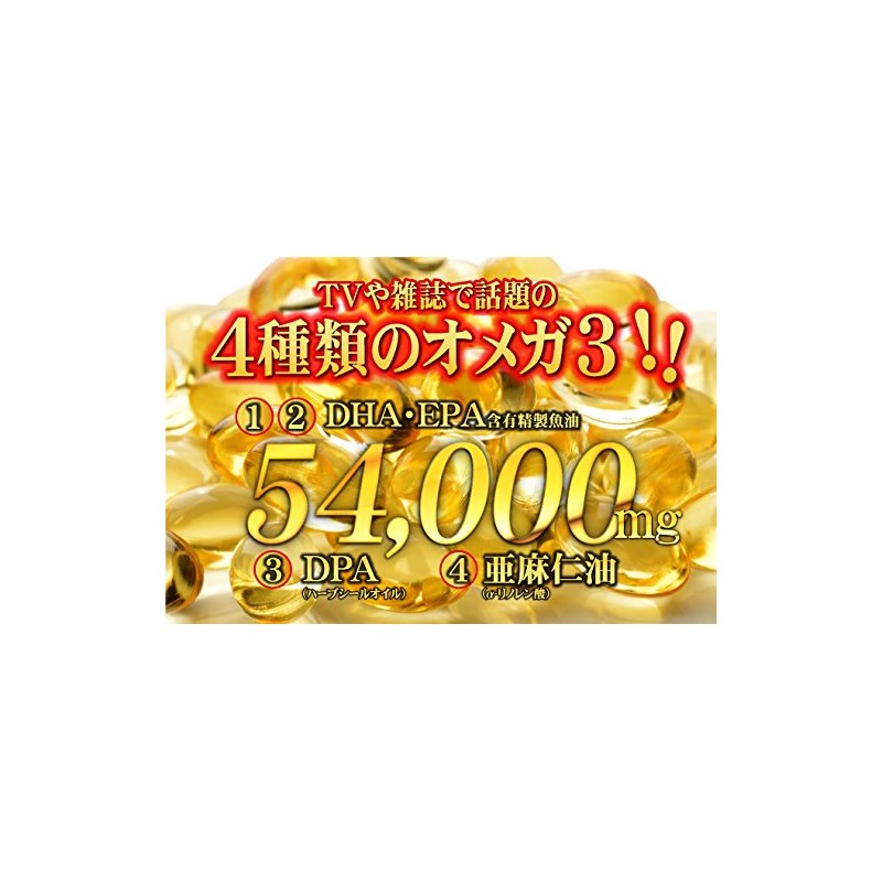 - 比べてください★【配合量に自信!】4種のオメガ3、DHA+EPA+DPA+α-リノレン酸(亜麻仁油)を配合。1粒にDHA+EPA精製魚油300mg高配合!1袋ではなんと54,000mg
