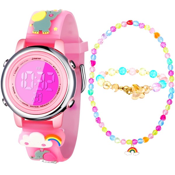 【ペコチャイム】子供 デジタル 腕時計 6歳 以上 女の子 7色LED 防水 ストップウォッチ アラーム ジュエリーセット ネックレス ブレスレット シール ギフトBOX レインボー エレファント ピンク