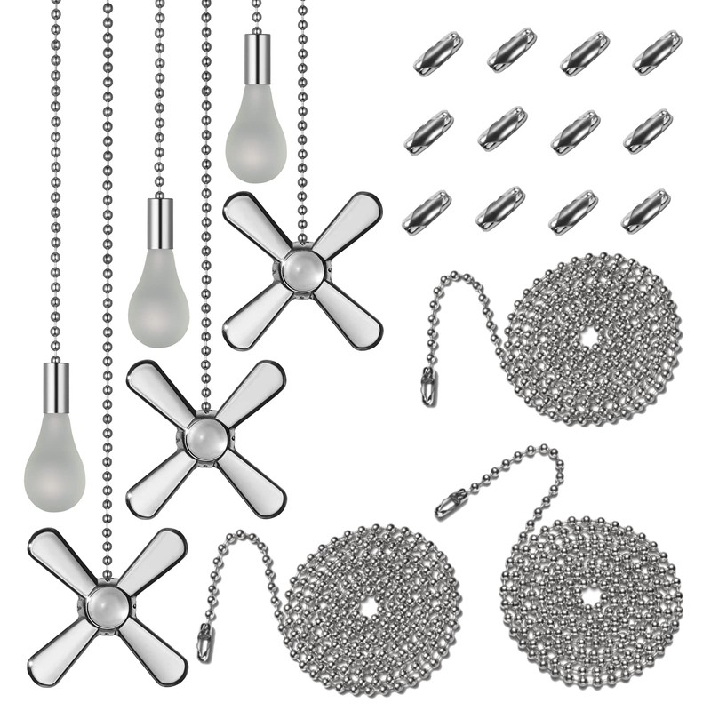 - Fan pulls set includes: 3 pieces 12 inchs light bulb shaped & 3 pieces 12 inchs fan shaped pull chains, 3 piece 36 inches bead pull chain and 12 pieces extra connectors (Just as the image shows).