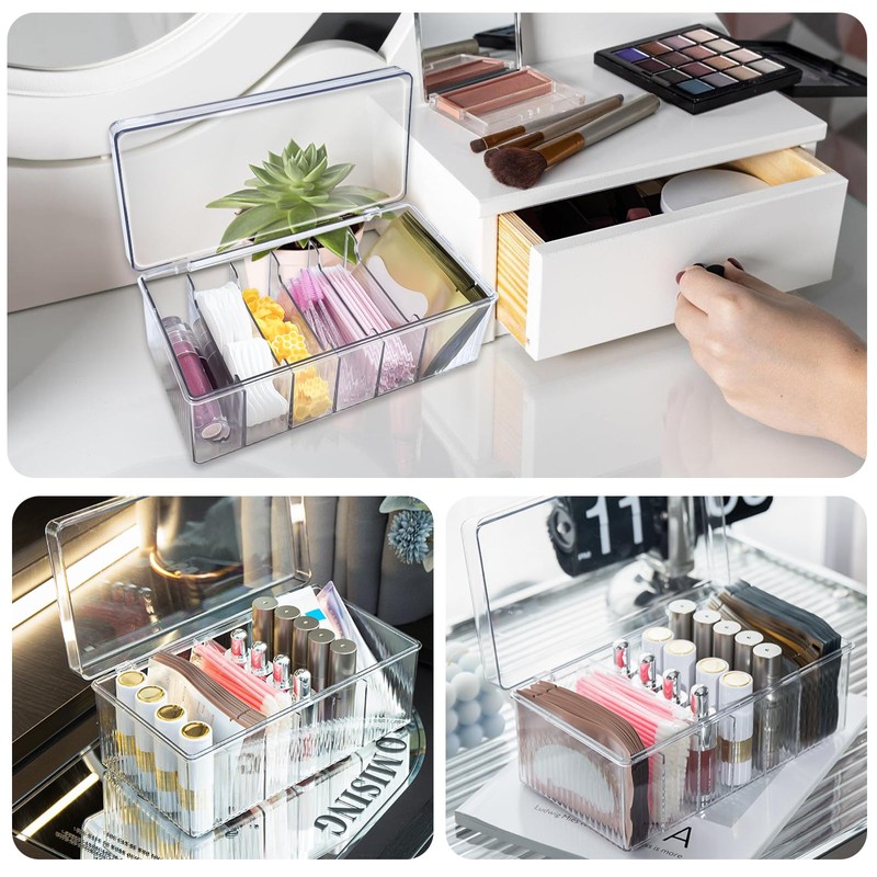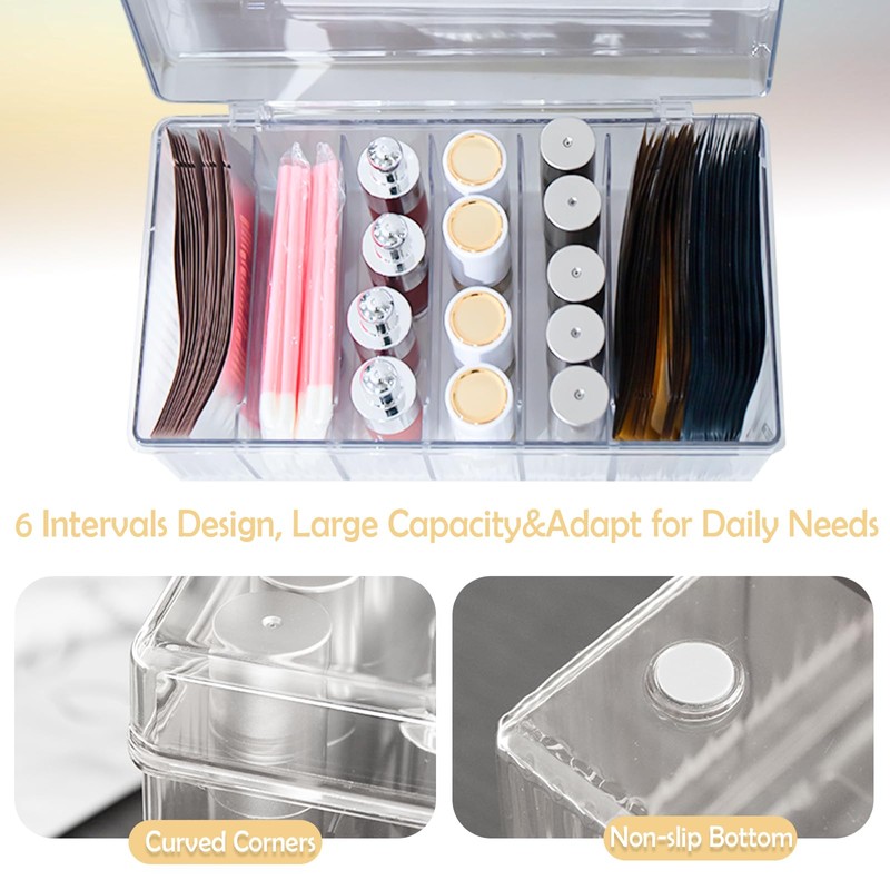- Dust-Proof Lid:Featuring a specialized dust-proof lid, this acrylic desk organizer protects your supplies, ensuring cleanliness. With six fixed compartments, you can easily store and access your essential items like disposable mascara wands, lash primer, lash glue remover, and micro brushes. Non-slip points at the bottom and included adhesive pads allow you to secure it on any table or lash cart, making it a versatile addition to your collection of clear storage drawers