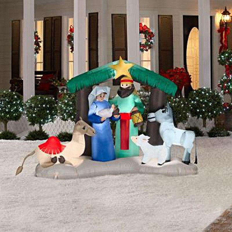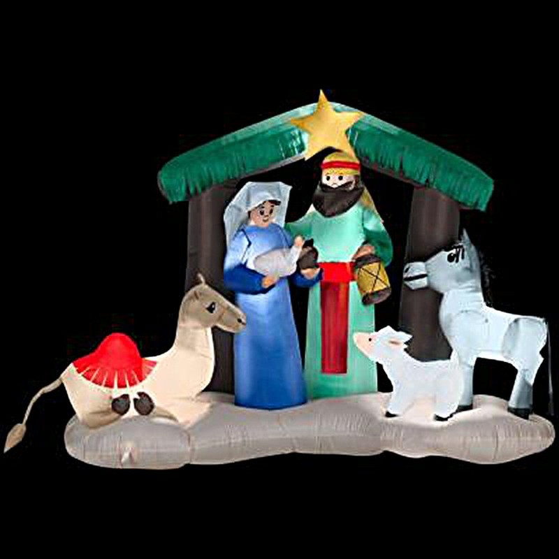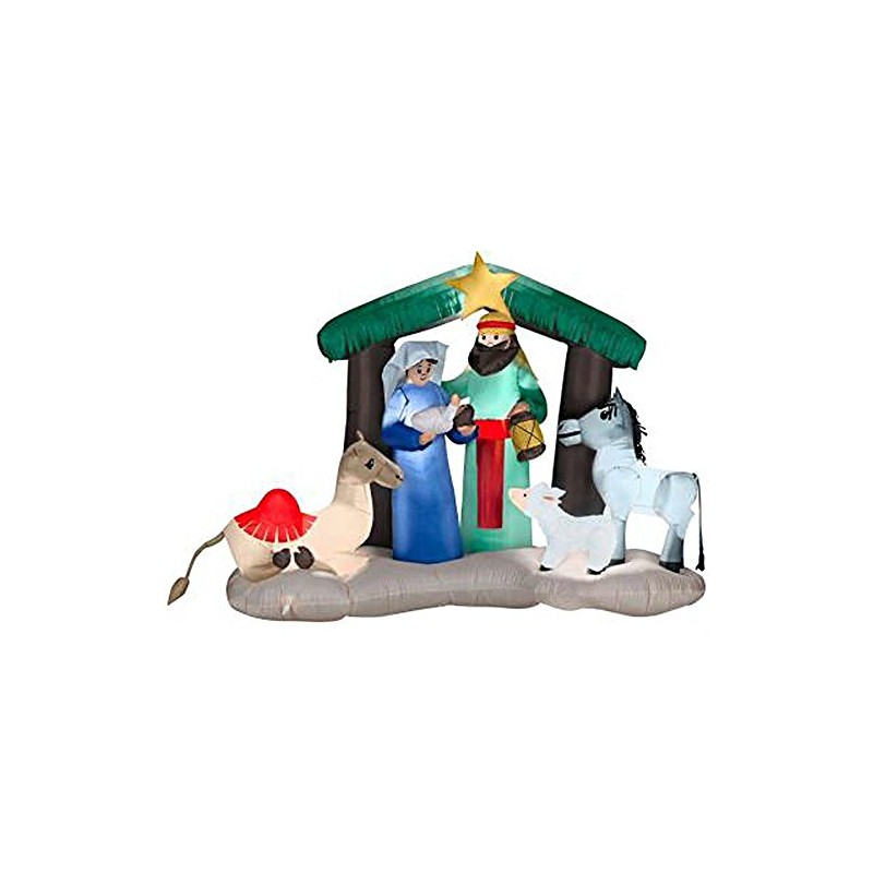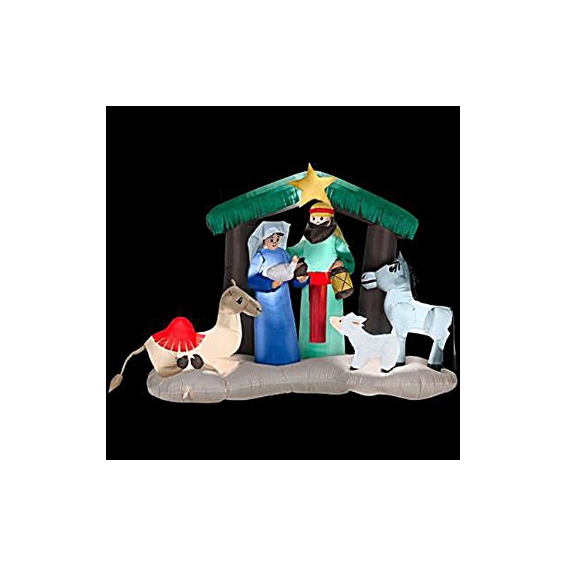 Decorate your home in the miracle of Jesus' birth with this inflatable nativity scene. Mary and Joseph hold the newborn king under a manger as a camel, lamb and donkey look on. Illuminating by interior LED lighting, it's a wonderful addition to your seasonal decorations.