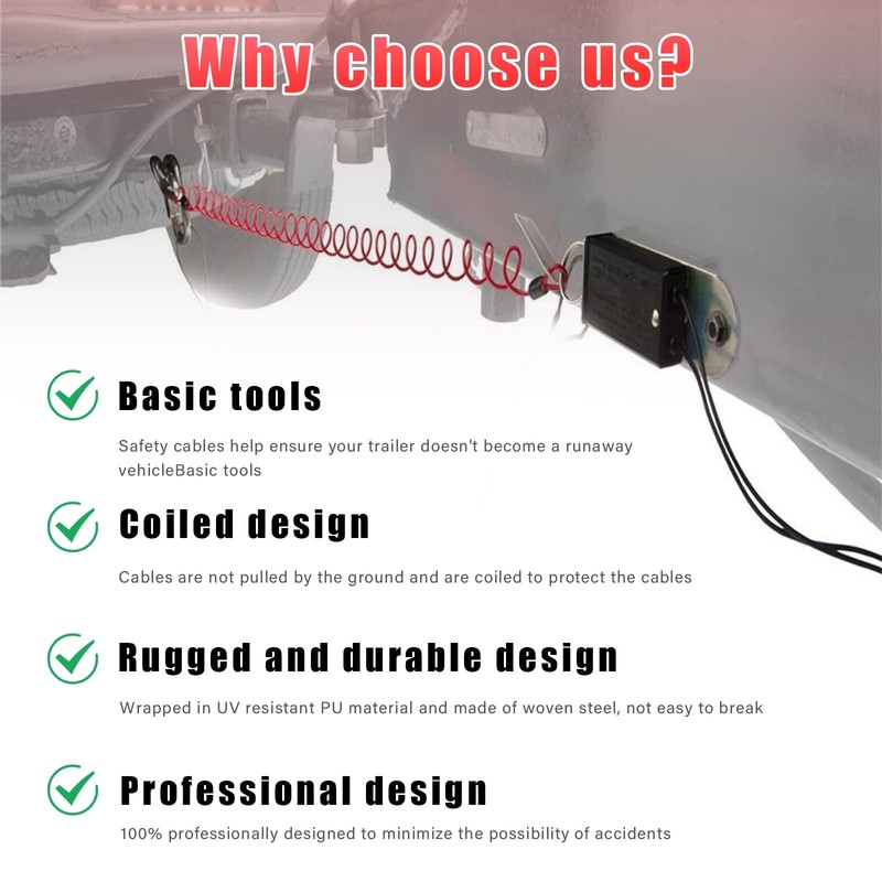 - 【Easy Installation】: When using this trailer brake safety cable, connect the cotter ring with a pin, then pull out the cable and attach the hook and loop to the trailer. Installation can be completed in minutes without the use of other tools.