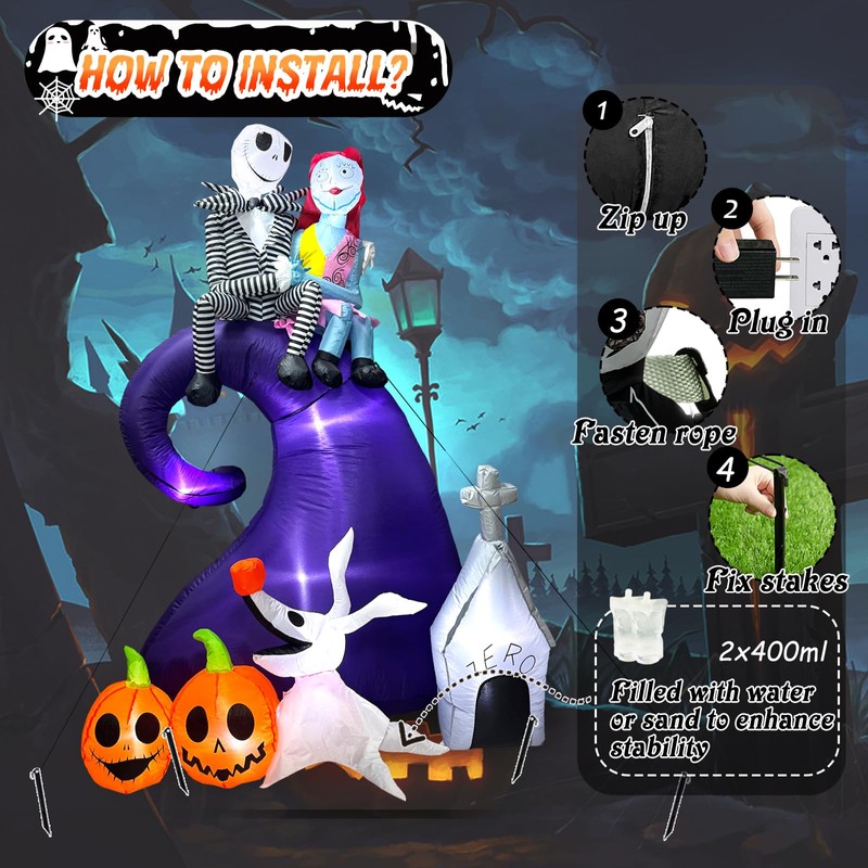 - 【Easy to Set Up】: Halloween cemetery decoration has a built-in powerful blower, can automatically and quickly inflate the Halloween outdoor decor within minutes, halloween party supplies just place the water bag and ground stake can be firmly fixed on the lawn.