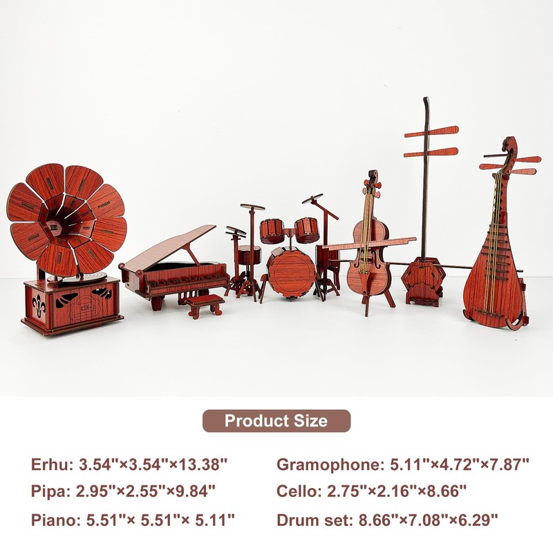 - 【Engaging Music Instrument Set】 Experience the joy of assembling these elaborate wooden 3D puzzles. This set includes six musical instruments: a piano, gramophone, drum kit, cello, erhu, and pipa. Each puzzle piece is crafted with high-quality wood and exquisite craftsmanship, not easily breakable, ensuring durability and a satisfying puzzle experience. Add joy and challenge to your life.