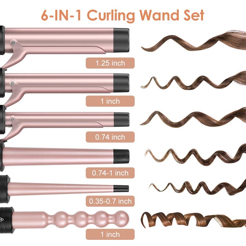 - 6-IN-1 CURLING WAND SET: The ceramic curling Iron set includes 6 tourmaline ceramic barrels (1.25'', 1'', 0.74'', 0.35''-0.7'', 0.74''-1'' and 1'' Spiral barrel), which will allow maximum versatility. With 6 different size, you can make different hairstyles like corkscrew curls, waves, big curls for body and bounce and ringlets.