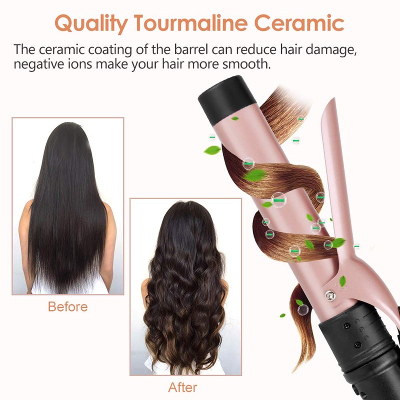 - INTERCHANGEABLE CERAMIC BARRELS: The hair curler is made of professional ceramic tourmaline, it can produce a potent mass of negative ions to seal moisture into your hair and protect each cuticle, maximum eliminate frizz and static electricity, help to make smooth and shiny hair style.