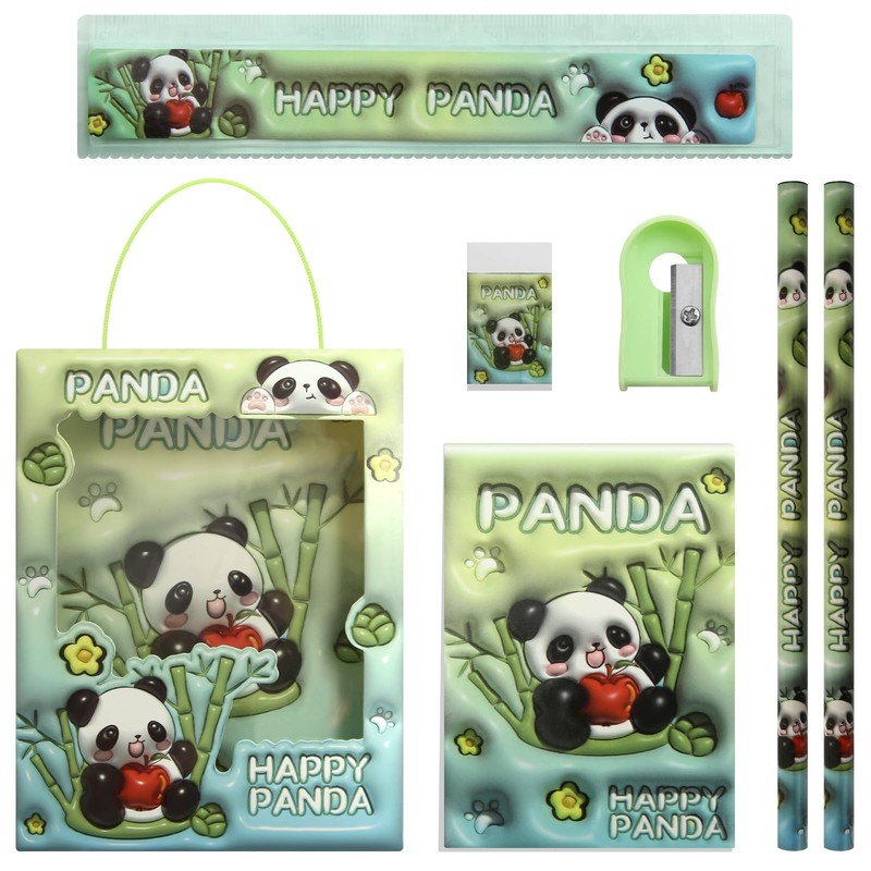 6 in 1 Green Panda Stationery Set Gift Box Includes 1 Cute Panda Mini Notebook 2 Panda Pencil 1 Eraser 1 Plastic Ruler 1 Pencil Sharpener for Party Kid Student Study Gift School Office Accessories