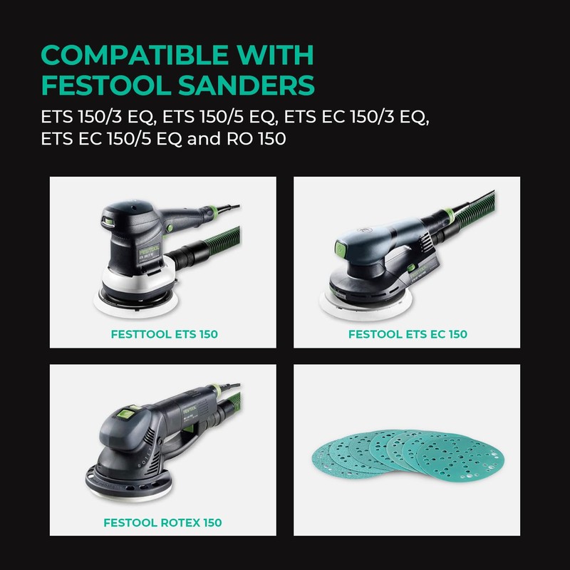 - 【COMPATIBLE WITH FESTOOL SANDERS】 - our sanding disc fits all Festool 150 Series ETS and Rotex random orbital sanders with 6" (150mm) pads including ETS 150/3 EQ, ETS 150/5 EQ, ETS EC 150/3 EQ, ETS EC 150/5 EQ and RO 150;