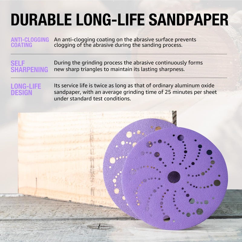 - 【Hook and Loop】 The 150mm sandpaper adopts a high-strength nylon hook and loop backing to ensure that the sandpaper is firmly adsorbed on the sanding machine pad and is not easy to slide or fall off during high-speed operation.